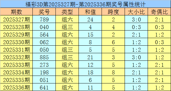 开奖回顾:福彩3D第2025336期开出奖号641。奖号形态为组六,奇偶比为1:2,012路比为1:2:0,大小比为1:2,和值为11,跨度为5。