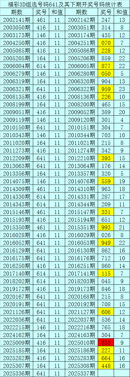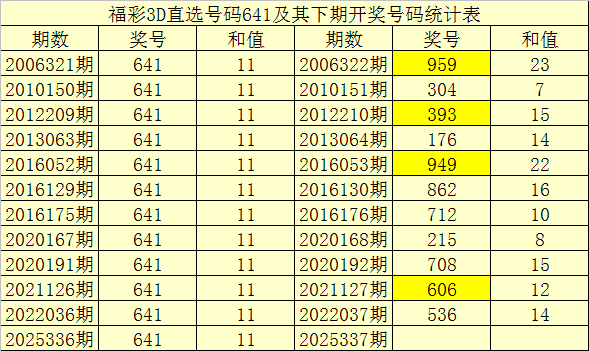 一、开奖回顾:第2025336期福彩3D奖号为641。奖号奇偶比为1:2,和值为:11,跨度为:5。
