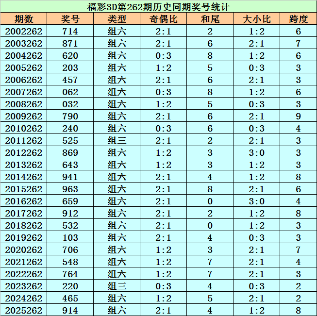 福彩3D历年第262期同期奖号为:714 871 620 203 457 062 032 790 240 525 869 643 941 963 659 912 532 103 706 548 764 220 465 914。