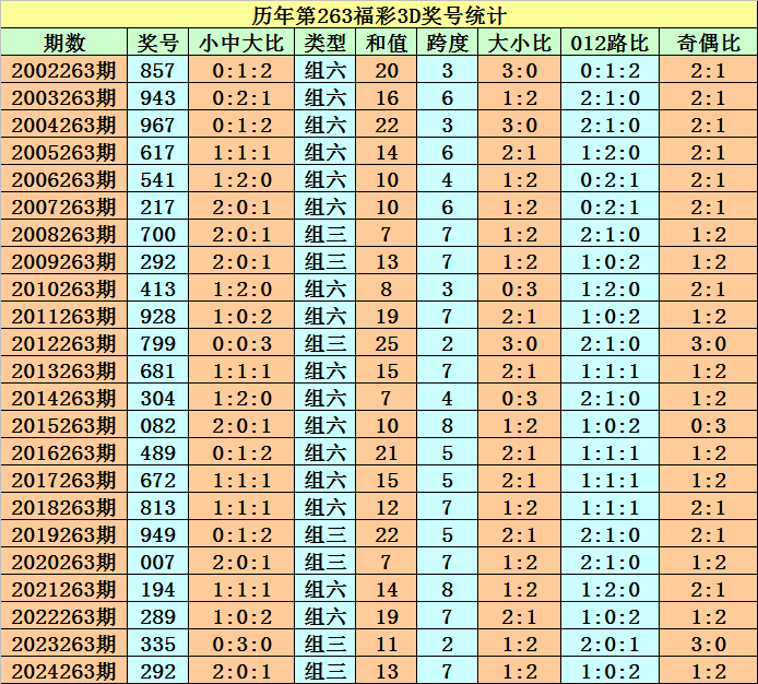 在历年同期开奖中,组三出现7次,组六开出16次,去年同期为组三,本期注意组三重复出现。