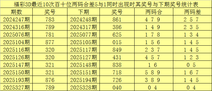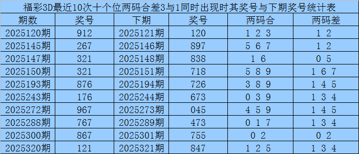 十个位合差分析:上期奖号十个位开出76组合,两码合为3,两码差为1,最近10次十个位两码合3与两码差1同时出现时,其奖号和下期奖号分别为: