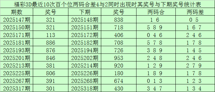 百个位合差分析:上期奖号百个位开出86组合,两码合为4,两码差为2,最近10次百个位两码合4与两码差2同时出现时,其奖号和下期奖号分别为: