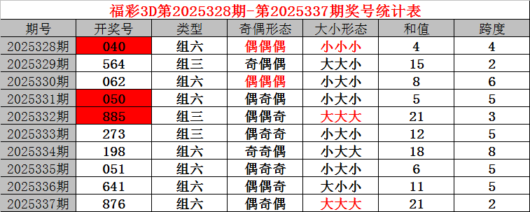 上期回顾:福利彩票3D第2025337期开奖结果876。奖号:偶奇偶、大大大,和值21,跨度2。