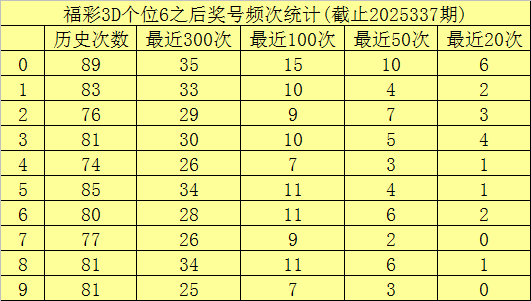 个位杀号:上期个位奖号为6,历史上个位奖号6共开出808次,最近100次个位奖号6出现时,其下期号码0-9开出次数分别为:奖号0开出15次,5、6、8开出11次,1、3开出10次,2、7开出9次,4、9开出7次。