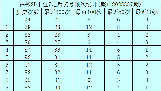 十位杀号:上期十位奖号为7,历史上十位奖号7共出现825期,前100次十位开出奖号7时,其下期0-9奖号频次分别为:奖号4开出14次,1、6、9开出12次,5、7开出11次,0、2开出8次,3、8开出6次。