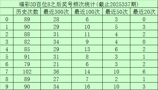 百位杀号:上期百位开出号码8,历史上百位号码8已开出886次了,最近100次百位号码8出现之后,其下期各号码频次分别为:号码9出现16次,7出现14次,4出现13次,2出现11次,1出现10次,3出现9次,5出现8次,8出现7次,0、6出现6次。
