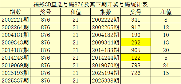 一、开奖回顾:第2025337期福彩3D奖号为876。奖号奇偶比为1:2,和值为:21,跨度为:2。
