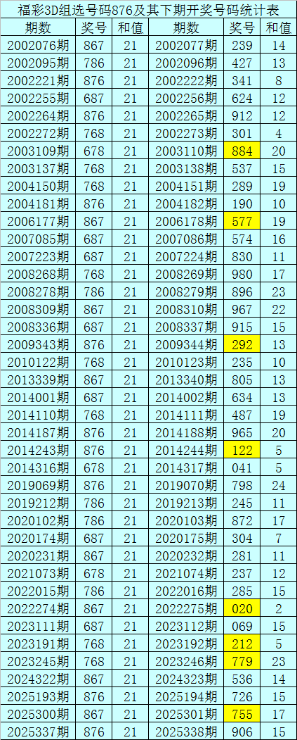 二、组选分析:历史上组选号码876开出了40次,其下期奖号分别为:239-427-341-624-912-301-884-537-289-190-577-574-830-980-896-967-915-292-235-805-634-487-965-122-041-798-245-872-304-281-237-285-020-069-212-779-536-726-755,其开出期数和下期奖号统计为: