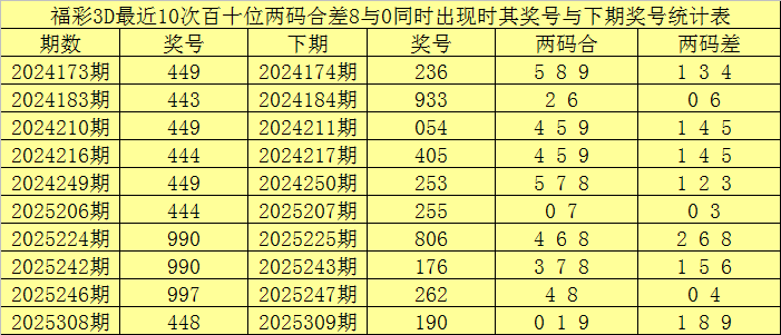 百十位合差分析:上期奖号百十位开出99组合,两码合为8,两码差为0,最近10次百十位两码合8与两码差0同时出现时,其奖号和下期奖号分别为: