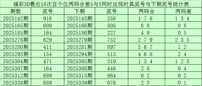 从以上统计可以看出,百个位两码合差5与3同时出现之后其下期两码合差表现最热的4个分别为:0124,本期百个位两码合差可以参考这四码中的数据。