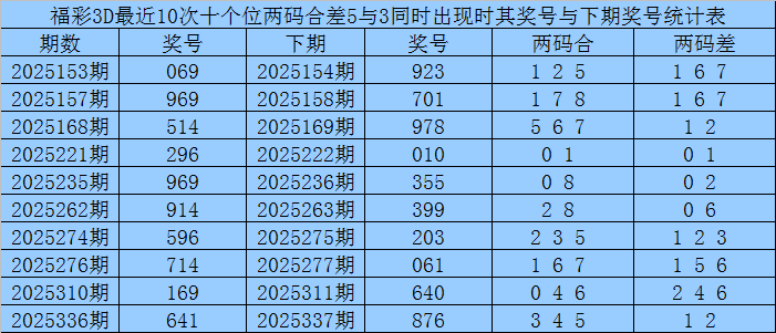 从以上统计可以看出,十个位两码合差5与3同时出现之后其下期两码合差表现最热的4个分别为:0126,本期十个位两码合差可以参考这四码中的数据。