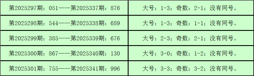 统计3D历史上已开出的奖号发现,在连续5期开奖号码中:3D在第2025297期-第2025301期分别开出奖号:051-544-385-867-755。