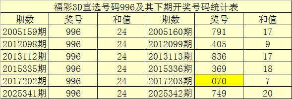 二、组选分析:历史上组选号码996开出了26次,其下期奖号分别为:949-499-853-295-791-288-173-223-368-196-439-618-405-836-303-369-916-043-760-070-989-503-795-701-355,其开出期数和下期奖号统计为:
