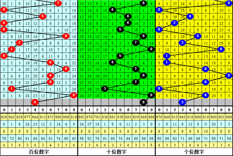 4、号码0-9出现开出频次分别为:号码9出现13次,号码3出现12次,号码0出现8次,号码5、6、8出现7次,号码1、7出现6次,号码4出现5次,号码2出现4次。一般来说,表现最冷的三码:2、4、7不会同时出现,本期杀一码:2;表现最热的四码:0、3、5、9中一般会出现奖号,本期注意号码;3。