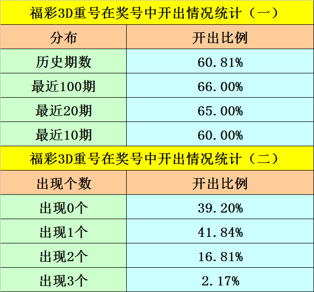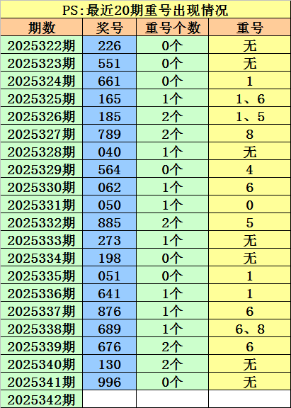 最近100期开奖中,含有重号的奖号有66期,最近20期含有重号的奖号有13期,最近10期含有重号的奖号有6期。本期注意重号落号。