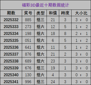 开奖回顾:福彩3D上期开奖号为996,和值为24,跨度3,其中奖号大小比为3:0