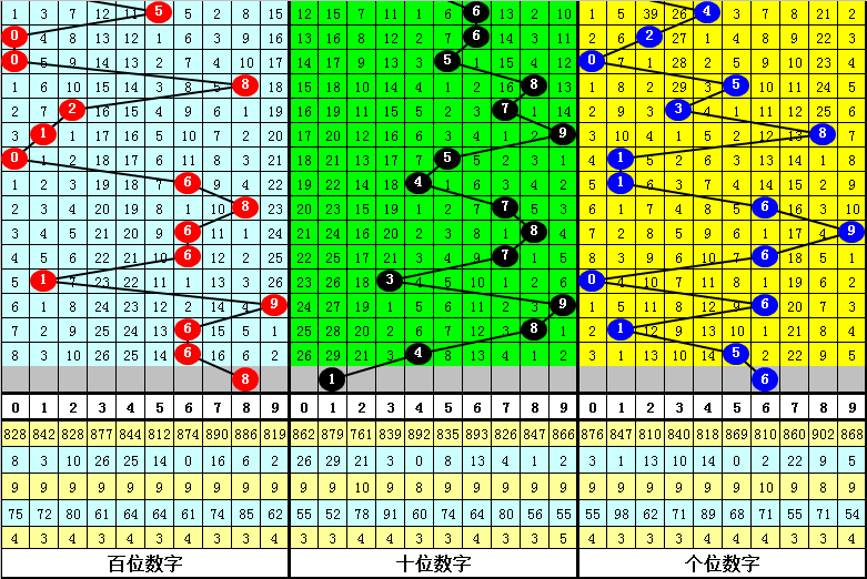 百位分析:上期百位开出奖号:6,最近9期该位奖号大小比为7:2,其中大号6出现5次,8、9出现1次,5、7出现0次,小 号0、1出现1次,2、3、4出现0次,本期百位参考大号,胆码关注8。