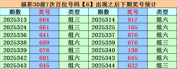 在百位号码6前7次开出之后,其下期分别开出号码:9、1、8、6、1、6、6,其中号码大小比为5:2,012路比为4:2:1,奇偶比为3:4。