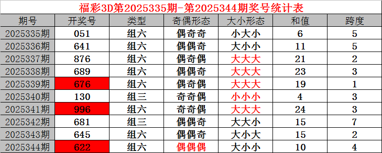 上期回顾:福利彩票3D第2025344期开奖结果622。奖号:偶偶偶、大小小,和值10,跨度4。