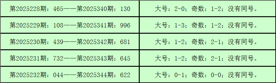 所以,3D第2025340期开出奖号:130,其大小比为0:3,奇偶比为2:1,012路比为2:1:0,与3D第2025345期奖号可能有同号。