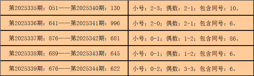 统计3D历史上已开出的奖号发现,在连续5期开奖号码中:3D在第2025335期-第2025339期分别开出奖号:051-641-876-689-676。