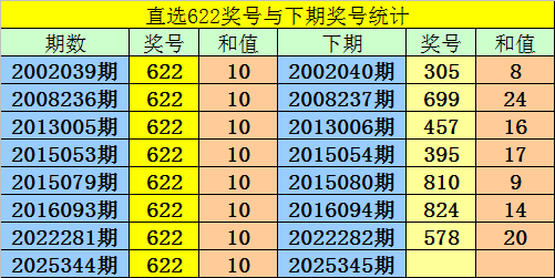 第2025344期3D奖号为:622,历史上该号码直选开出8次,下期号码分别为:305、699、457、395、810、824、578。