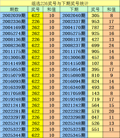 第2025344期3D奖号组选为:226,历史上该号码组选出现21次,下期号码分别为:305、953、787、925、427、699、905、457、107、395、810、824、493、143、719、564、578、047、526、551。