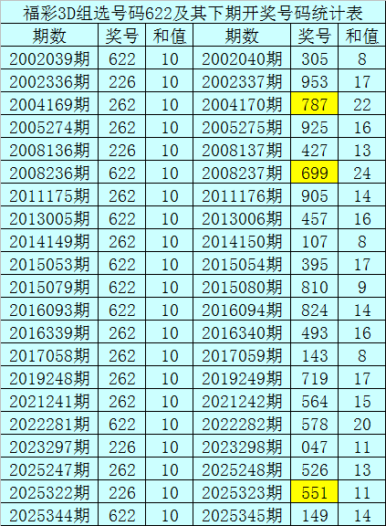 二、组选分析:历史上组选号码622开出了21次,其下期奖号分别为:305-953-787-925-427-699-905-457-107-395-810-824-493-143-719-564-578-047-526-551,其开出期数和下期奖号统计为: