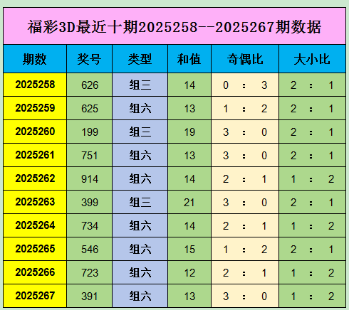 福彩3D上期开出奖号为391,奖号为组六形态,和值为13,奇偶比为3 : 0,大小比为1 : 2。
