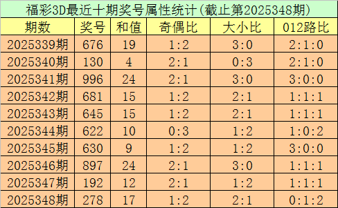 开奖回顾:第2025348期福彩3D奖号为278。奖号形态为组六,大小比为2:1,和值为17,奇偶比为1:2,012路比为0:1:2,跨度为6。