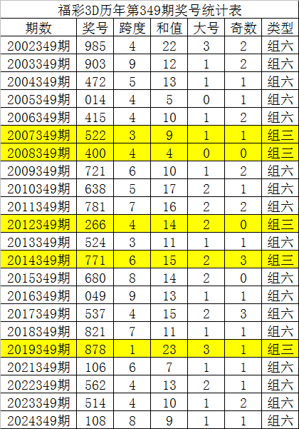 福彩3D历年第349期同期分别开出奖号:985、903、472、014、415、522、400、721、638、781、266、524、771、680、049、537、821、878、106、562、514、108,详细统计见下表: