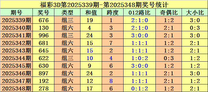 012路分析:上期012路比0:1:2,上期0路号码轮空,本期重防回补,看好2路号码走冷,012比参考1:2:0。
