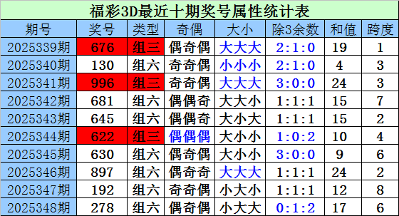 上期回顾:上期开奖奖号为278,类型:组六,偶奇偶,小大大,0:1:2,和值17,跨度6。