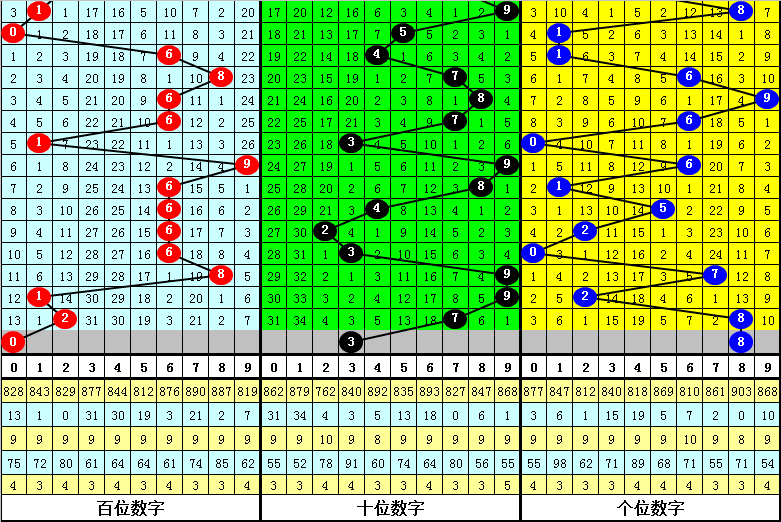 百位分析:该位最近10期开出了6个0路号码、2个1路号码、2个2路号码,0路号码热出。本期排除1路号码,参考号码:0。
