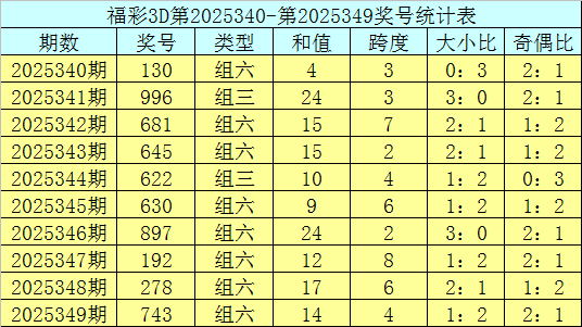 类型判断:上期奖号为743。号码3近10期开出3次,走势较冷,号码4出现2次,走冷,号码7出现3次,走势较冷,上期总体遗漏走温,本期注意温码奖号。