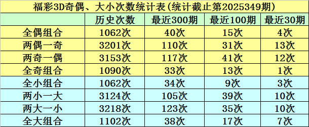 在前10期开奖中,全大组合出现2次,全小组合出现1次,两小一大组合出现4次,两大一小组合出现3次,本期预计开出两小一大组合。