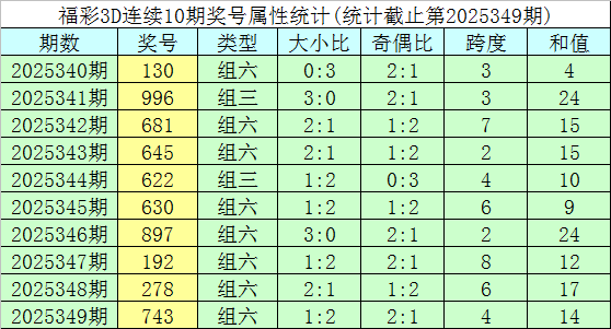 开奖回顾:福彩3D第2025349期奖号为743。奖号形态为组六,大小形态为大小小,奇偶形态为奇偶奇,和值为14,跨度为4。
