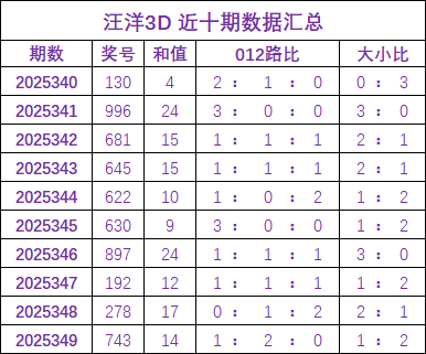 汪洋福彩3D第2025350期推荐: