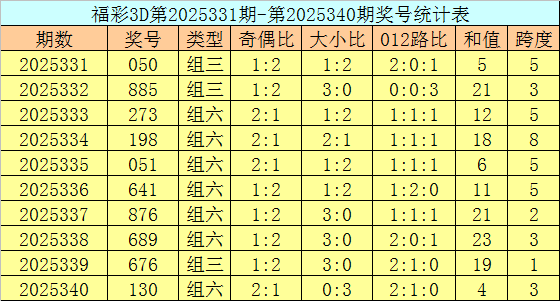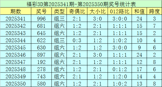 上期回顾:福彩3D第2025350期开奖号码为580,组选类型为组六,奇偶比为1:2,大小比为2:1。