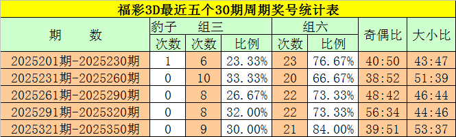 在最近一个30期周期内(第2025321期-第2025350期),豹子奖号没有出现,组三奖号开出了9次,所占比例为36%,组六奖号共出现21期,开出比例为84%,组六号码连续出现6期,表现非常活跃,本期预计奖号为组六号码。
