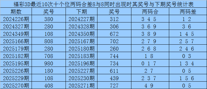 十个位合差分析:上期奖号十个位开出80组合,两码合为8,两码差为8,最近10次十个位两码合8与两码差8同时出现时,其奖号和下期奖号分别为:
