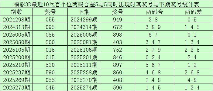 百个位合差分析:上期奖号百个位开出50组合,两码合为5,两码差为5,最近10次百个位两码合5与两码差5同时出现时,其奖号和下期奖号分别为: