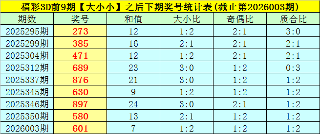 一、上期回顾:福彩3D第2026003期奖号为:601,奖号类型开出组六,大小比为1:2,奇偶比为1:2,和值为7,跨度为6,012路比为2:1:0。
