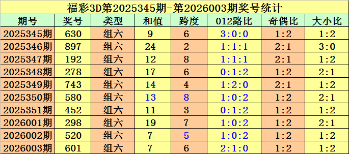 开奖回顾:第2026003期福彩3D奖号为601。