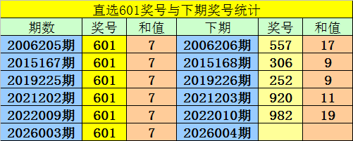 第2026003期3D奖号为:601,历史上该号码直选开出6次,下期号码分别为:557、306、252、920、982。