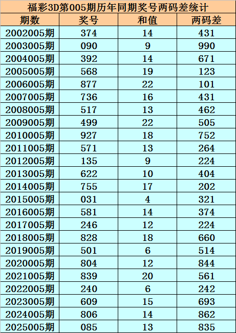 福彩3D第005期,历史上期开出24次奖号,其奖号分别为:374、090、392、568、877、736、517、499、927、571、135、622、755、031、581、246、828、501、804、839、240、609、806、085,奖号两码合差分别开出: