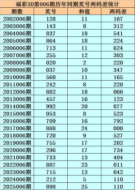 福彩3D第006期,历史上期开出24次奖号,其奖号分别为:128、143、837、864、713、255、020、037、560、242、882、457、992、053、709、888、720、755、296、733、887、715、212、898,奖号两码合差分别开出: