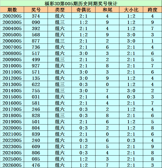 福彩3D历年第005期同期奖号为:374 090 392 568 877 736 517 499 927 571 135 622 755 031 581 246 828 501 804 839 240 609 806 085 476。