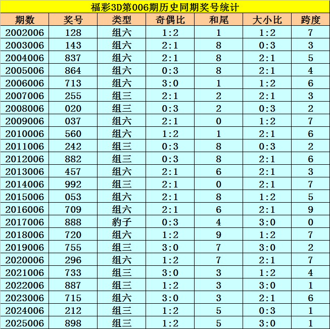 福彩3D历年第006期同期奖号为:128 143 837 864 713 255 020 037 560 242 882 457 992 053 709 888 720 755 296 733 887 715 212 898。