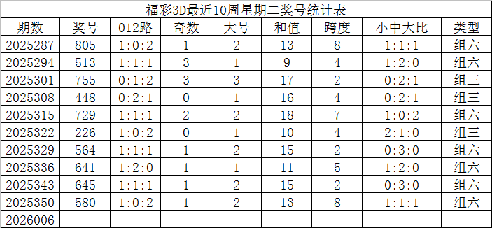 福彩3D第2026006期发哥推荐: